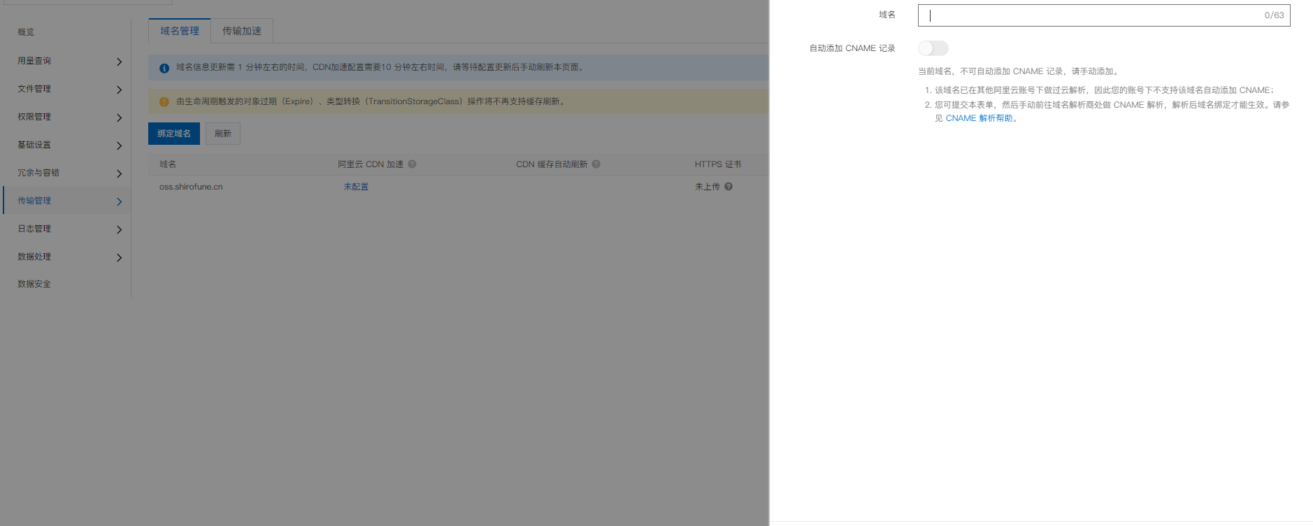 进入 OSS 控制台->进入 Bucket->传输管理->域名管理->绑定域名